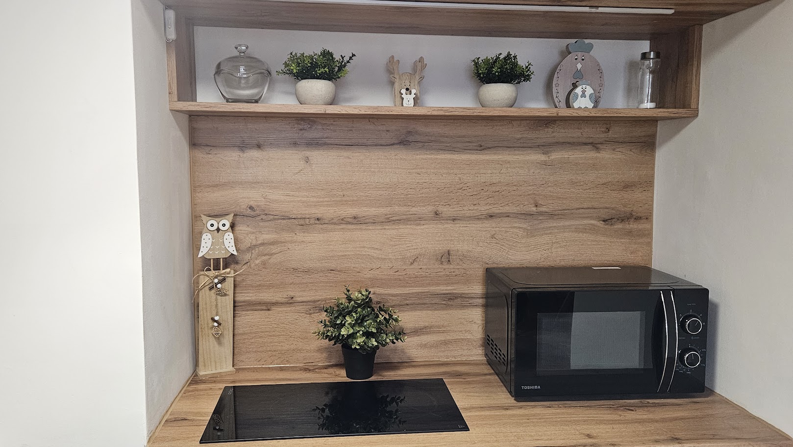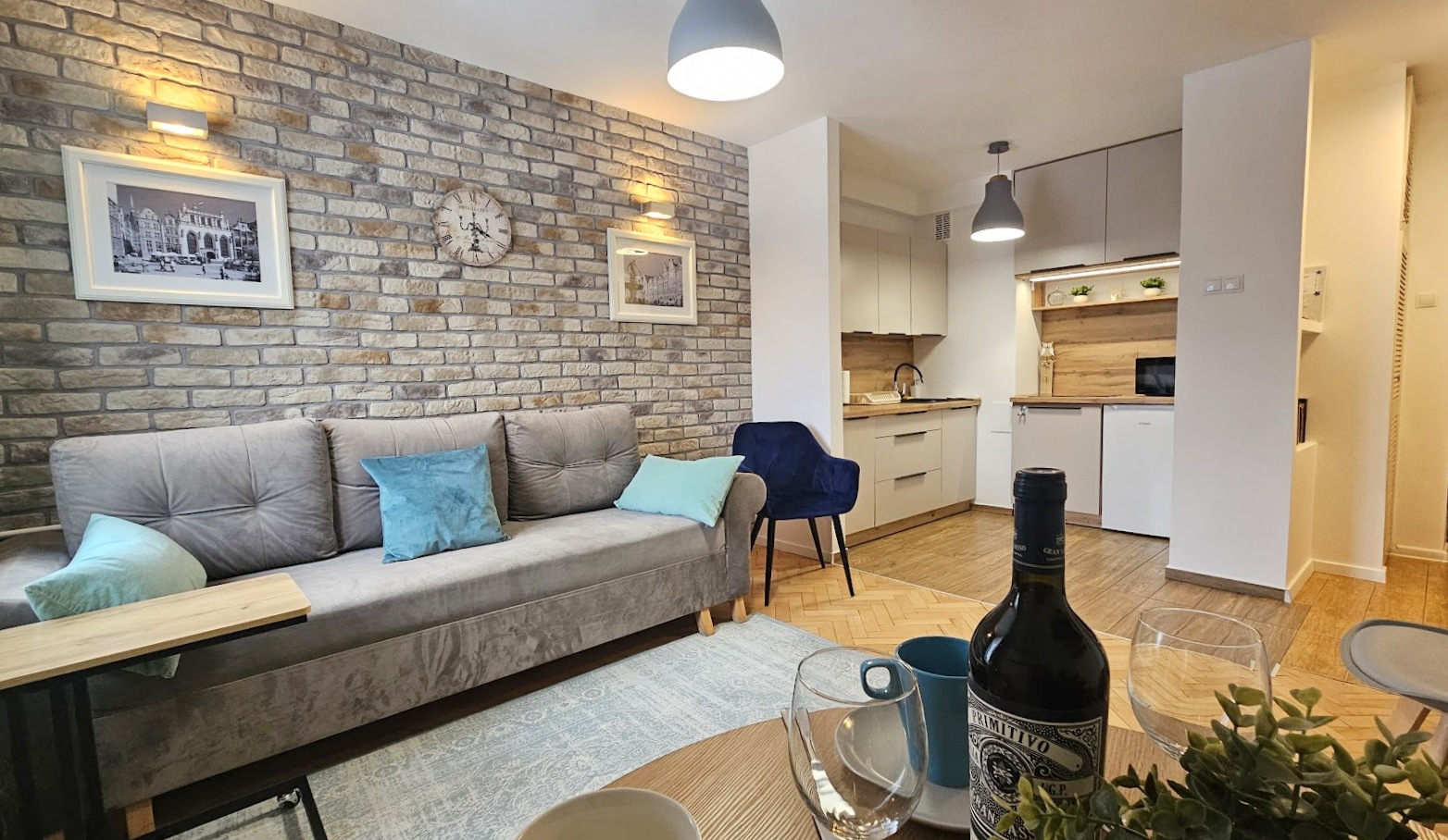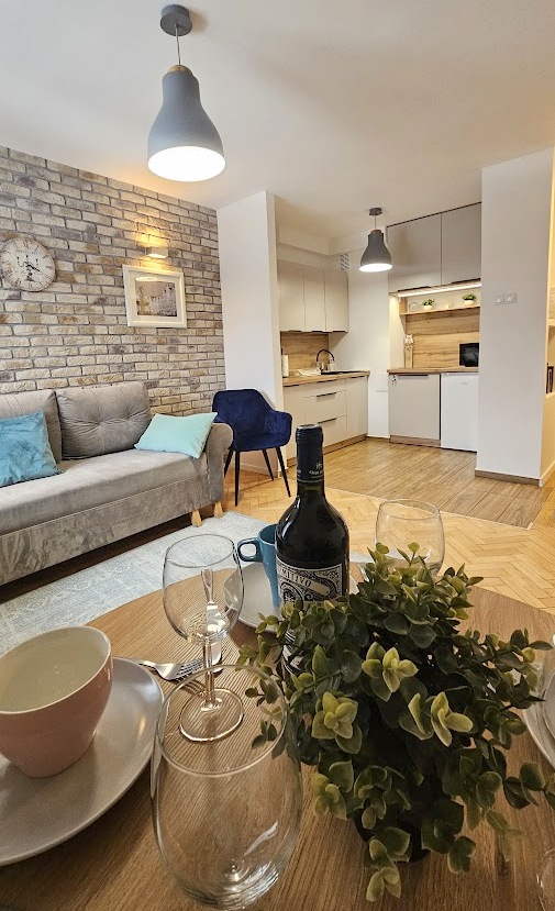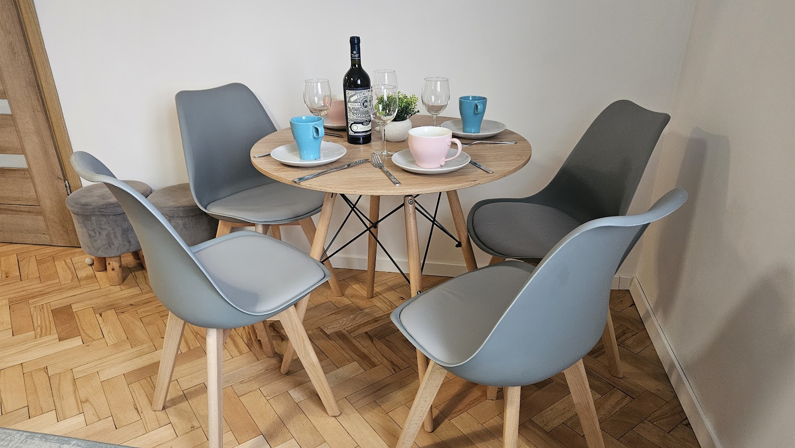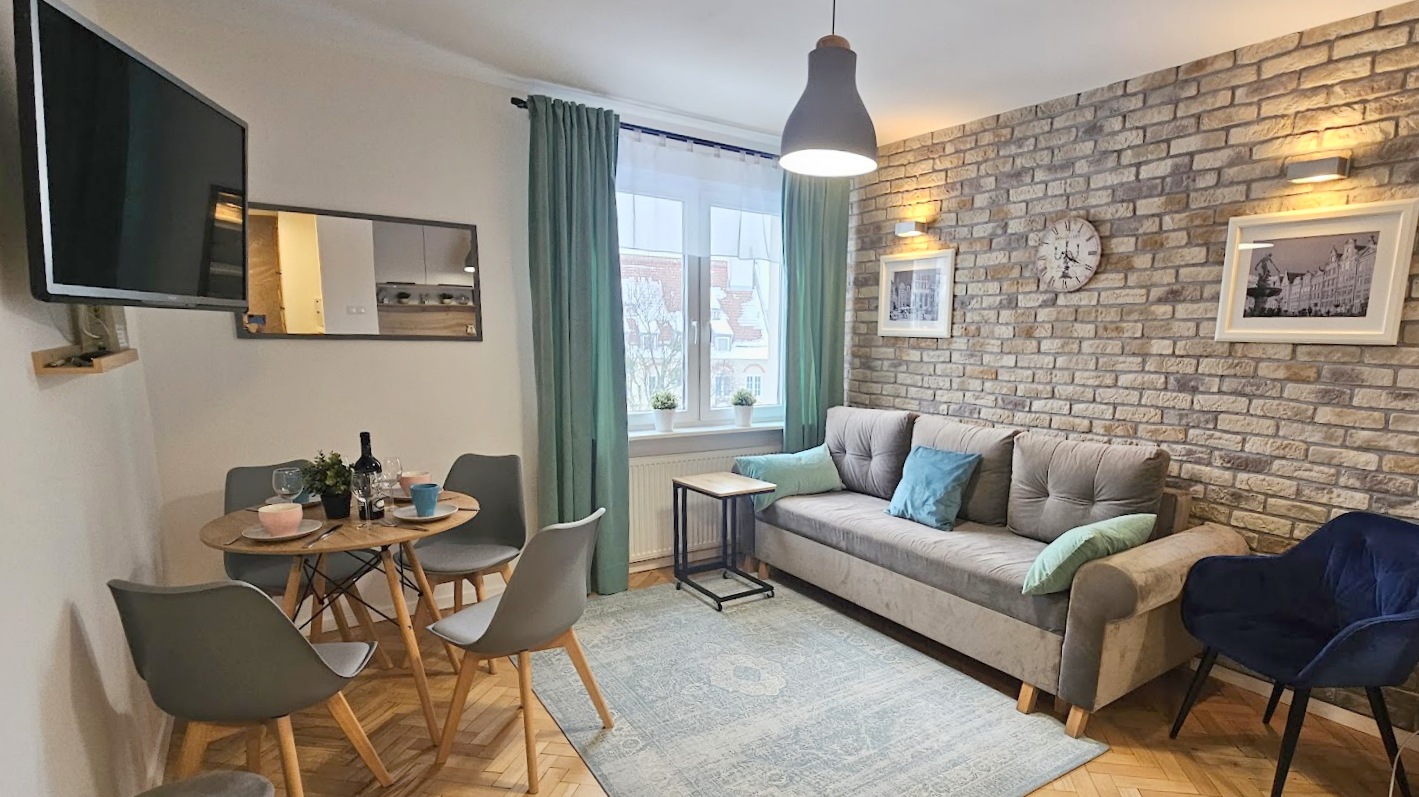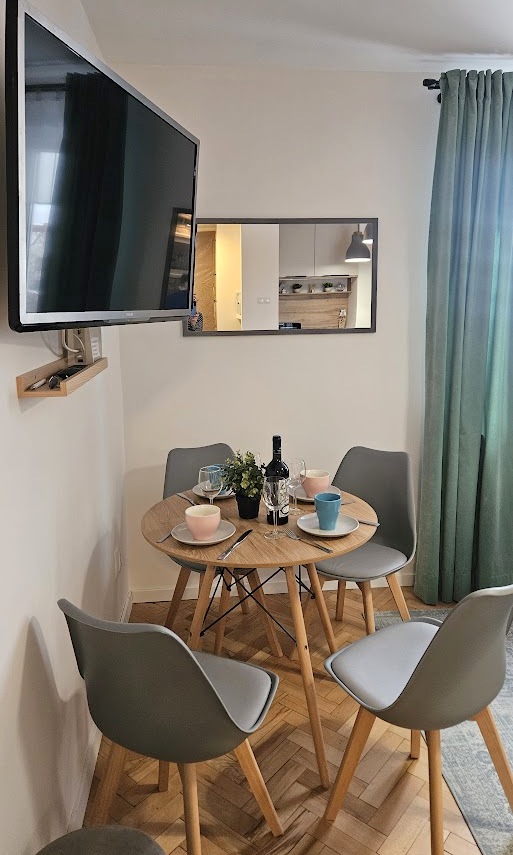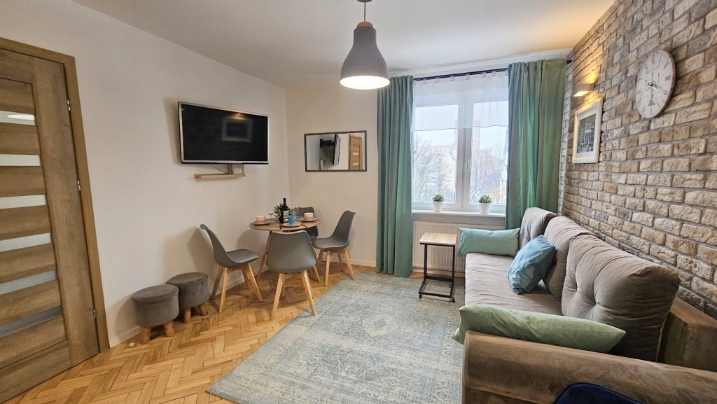 Stylowy i przytulny salonik z rozkładaną kanapą 140 cm, wygodnym fotelem, w którym można odpocząć po intensywnym zwiedzaniu miasta. Stolik z możliwością spożywania posiłków dla 4 osób.