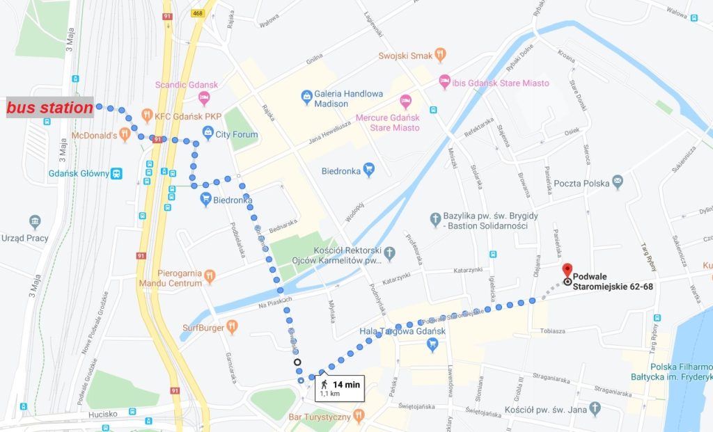 Apartament mieści się zaledwie 200 m od rzeki Motławy, którą widać z okna. Położenie jest idealne zarówno dla zwiedzających Stare Miasto (50 m do średniowiecznych murów) jak i osób przyjeżdżających w celach rozrywkowych czy na wypoczynek.